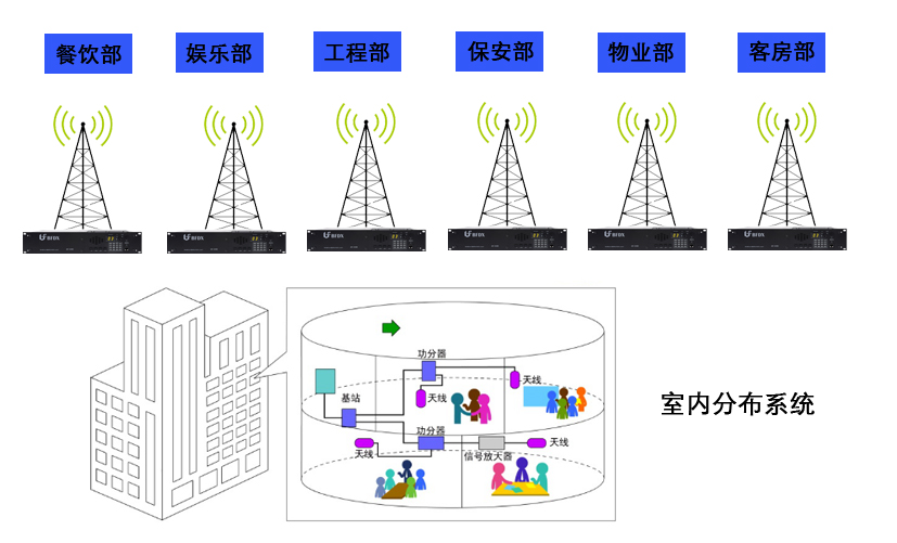 客戶要求無線對(duì)講系統(tǒng),主要功能應(yīng)用的部門:餐飲部、娛樂部、工程部、保安部、物業(yè)部、客房部六個(gè)部門分別設(shè)置獨(dú)立的頻道。無線覆蓋范圍,最好是做到整個(gè)酒店信號(hào)無縫全覆蓋。