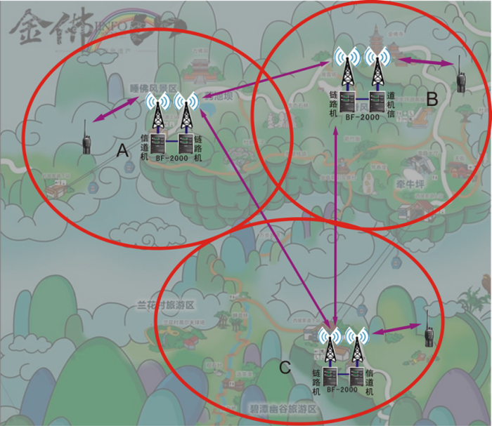 在該通訊方式中,信道機主要負責對個區(qū)域手持臺信號的收發(fā)工作,在各區(qū)域信道機接收的手持臺信號的同時,將通過該基站鏈路機的無線鏈路信號傳輸,將信道機接收到的信號傳輸至其他鏈路基站,由其他鏈路基站的信道機將信號下發(fā)至各區(qū)域的手持機。在整個景區(qū)內實現(xiàn)一會百應的通訊效果。