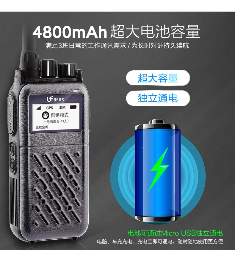 4800mAh超大的電池容量,能夠滿足3班日常的工作通訊需求,為長時對講持久續航。電池可通過Micro USB獨立通電,電腦、車充充電、充電寶即可通電,隨時隨地使用更方便。