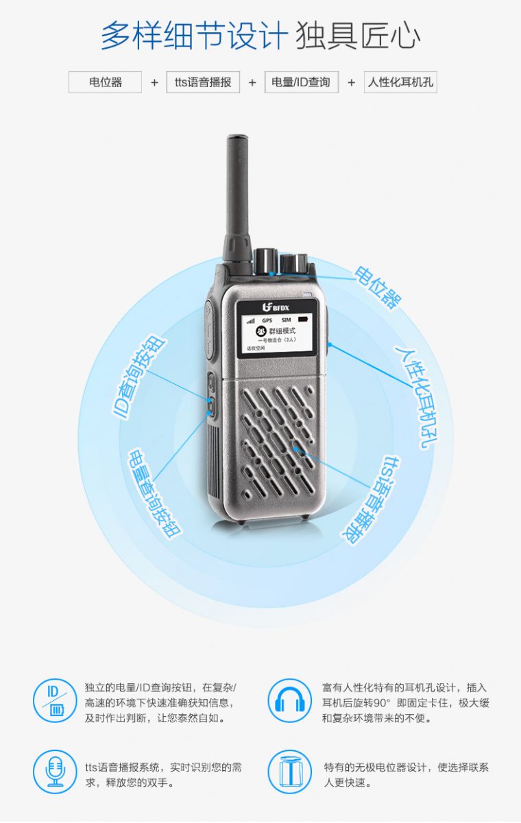 tts語音播報系統,實時識別您的需求,釋放您的雙手。特有的無極電位器設計,使選擇聯系人更快速。獨立的電量查詢和ID查詢按鈕,助您在復雜或高速的環境下快速準確地獲知信息,及時作出判斷,讓您更泰然自如。富有人性化特有的耳機孔設計,插入耳機后旋轉90°即固定卡住,不易脫落,極大緩和復雜環境帶來的不便。
