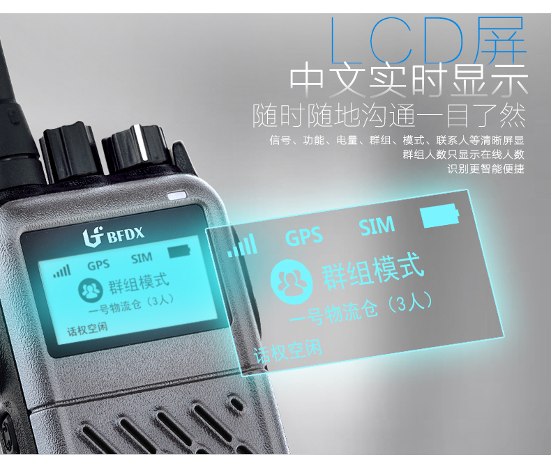信號、功能、電量、群組、模式、聯系人等清晰屏顯,只顯示在線群組人數,識別更智能便捷,滿足您隨時隨地溝通一目了然。
