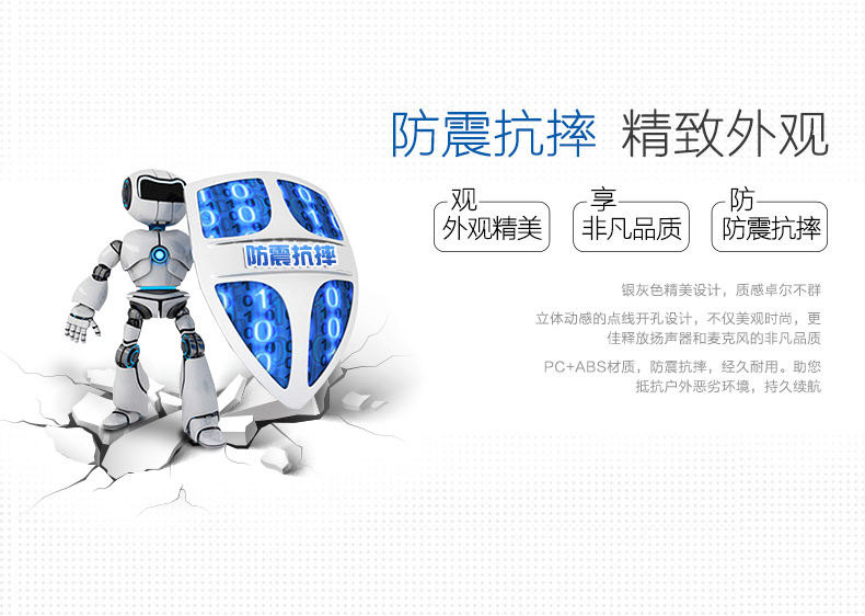 銀灰色精美設計,質感卓爾不群。立體動感的點線開孔設計,不僅美觀時尚,更佳釋放揚聲器和麥克風的非凡品質。PC+ABS抗摔材質,輕松應對意外墜落;防震抗摔,助您抵抗戶外惡劣環境,滿足您戶外復雜環境的應用。