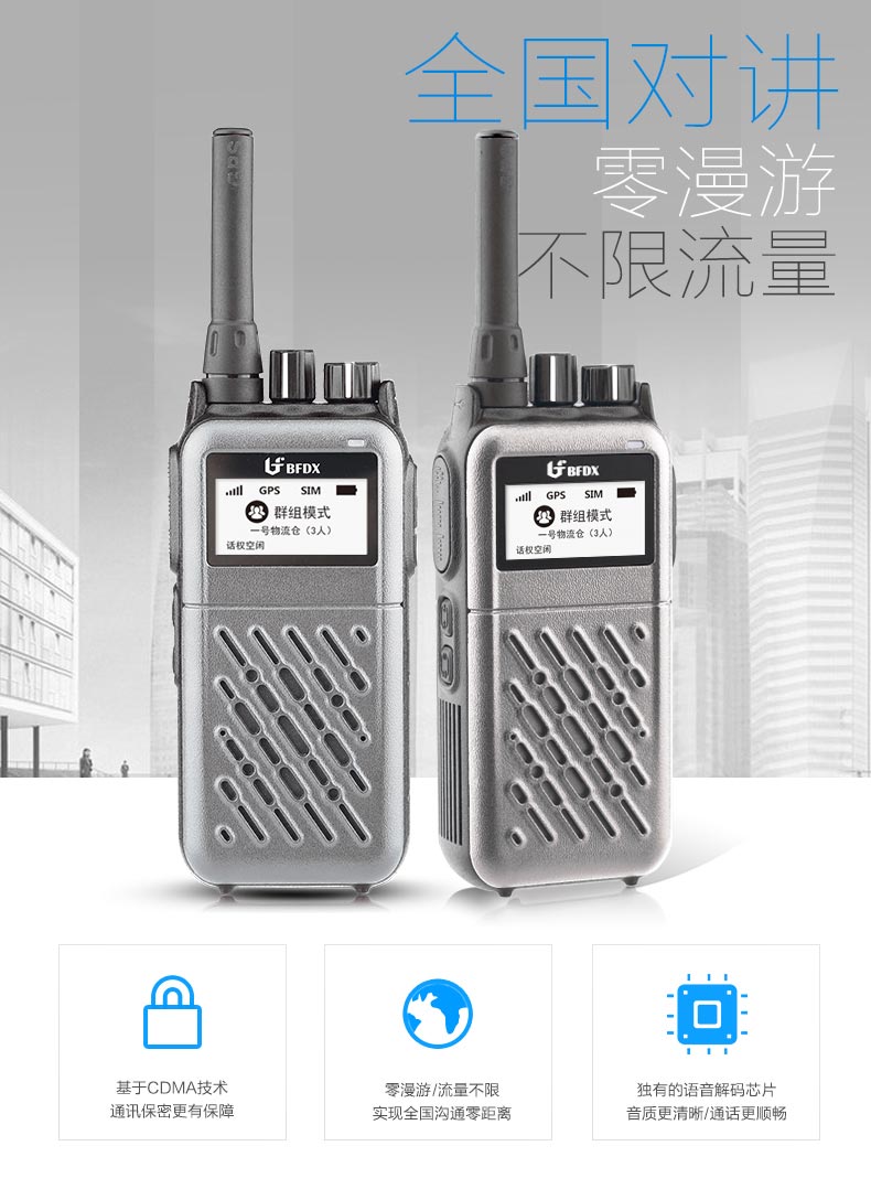 基于CDMA技術,通訊保密有保障。零漫游,流量不限,打破城市距離,實現全國溝通零距離。北峰獨有的語音解碼芯片,使得通話音質更加飽滿、清晰,對講暢通瞬達無障礙。