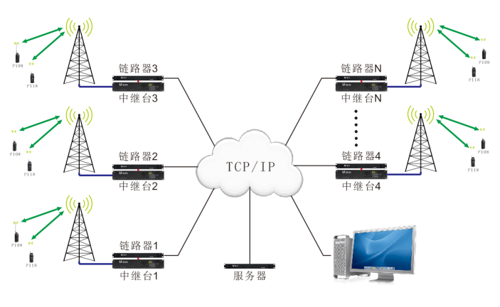 IP互聯是將無線電信號所承載的語音信號通過IP網絡進行傳輸的一種技術。通過TCP/IP網絡把多個IP中繼臺連接起來,用蜂窩及微蜂窩多區域覆蓋的方式解決跨區通訊及因為障礙物遮擋,造成覆蓋區內有大量盲區的問題。最終實現分布式對講機信號覆蓋和超長距離無中繼互聯的功能,并且能無縫接入到已有的對講機調度系統,方便指揮調度。
