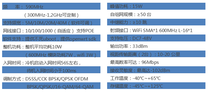 BF-MR916支持用戶300MHz~1.2GHz的定制化需求;頻寬5~40MHz可調整、軟件支持不死uboot、入網時間快、自組規模≥50臺、中繼≥10跳、最高數率可達96Mbps。能夠在應急現場快速部署,迅速構建起專網寬帶網絡環境,同時還可以在最前端現場至后方指揮車之間構建雙向音視頻通信。
