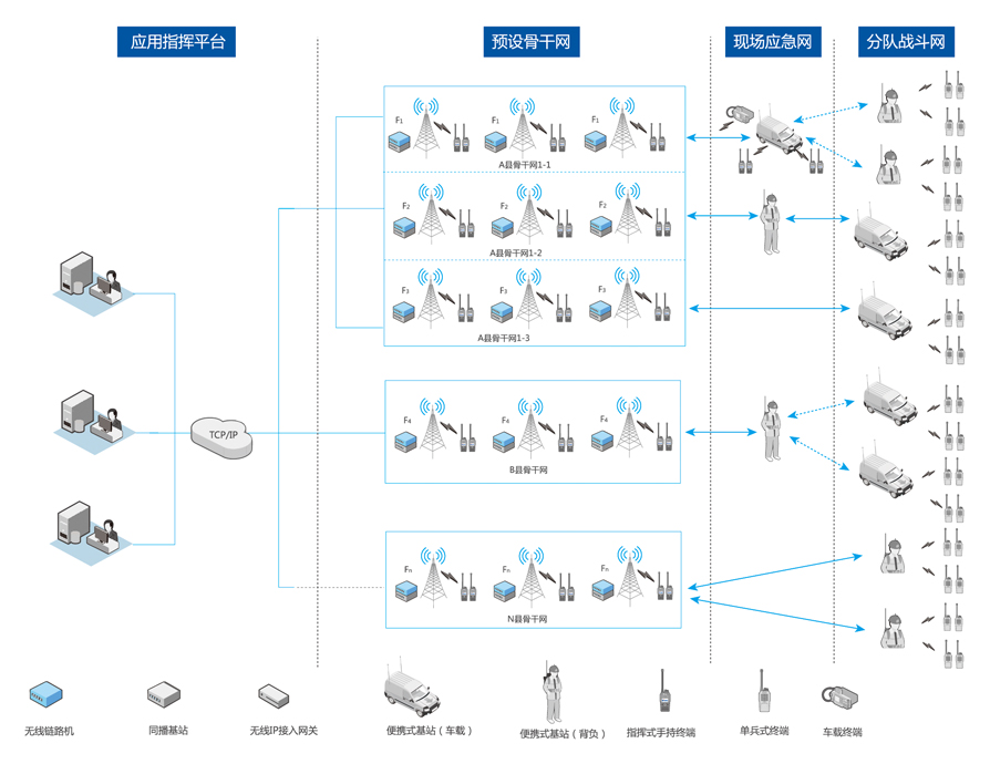 BF-9000任務關鍵型通信系統符合PDT/DMR通信體制并向下兼容模擬制式,系統整體設計采用預設骨干網、現場應急網、分隊戰斗網三層組網方式。同時系統可以與MESH無線自組網、超短波通信、北斗衛星通信、4G專網通信、4G公網通信、衛星通信等多種通信手段相結合實現融合通信。完美運用現代數字通信技術,充分結合應急通信保障場景,貼近實戰要求,便于快速部署穩定可靠。