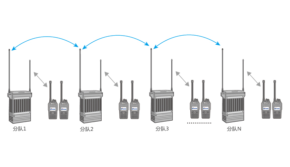 多臺便攜式數字雙頻中繼臺組網形成雙頻自組網網絡,雙頻中繼臺的某一段工作在自組網模式保障各分隊之間的互聯;另一段工作在同頻中繼模式保障本分隊內部通信。