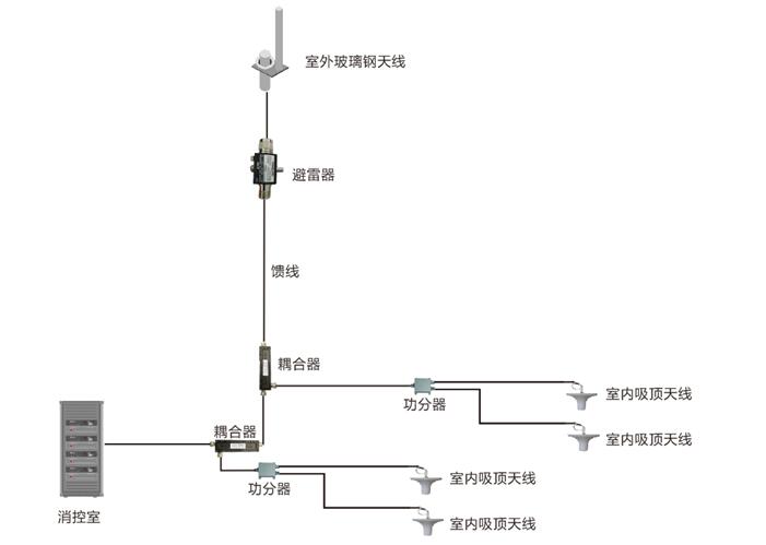 在需要覆蓋的地區中心(消控室)放置中轉臺,通過合路分路、干線放大器以及天饋系統等設備,將中轉臺的接收、發射天線分布于預覆蓋地區的各個角落。當對講機發起呼叫時,不再是靠對講機本機功率直接呼叫另一部對講機,而是呼叫中轉臺距離該對講機最近的接收天線,中轉臺收到該天線的傳回的呼叫信號后,控制所有發射天線自動轉發該呼叫信號,這樣,無論被呼叫的對講機在何位置,均能接收到呼叫信號。