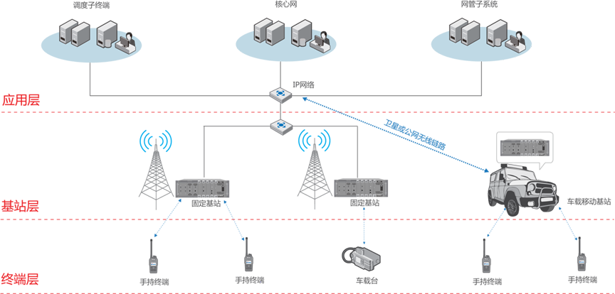 BF-9000任務關鍵型通信系統符合PDT/DMR通信體制并向下兼容模擬制式,系統整體設計采用預設骨干網、現場應急網、分隊戰斗網三層組網方式。同時系統可以與MESH無線自組網、超短波通信、北斗衛星通信、4G專網通信、4G公網通信、衛星通信等多種通信手段相結合實現融合通信。完美運用現代數字通信技術,充分結合應急通信保障場景,貼近實戰要求,便于快速部署穩定可靠。