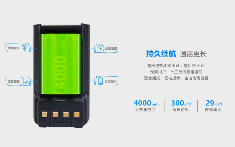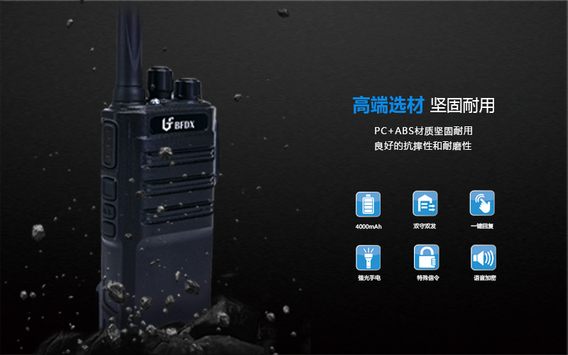 BF-500配置4000mAh超大容量聚合物電池,可超長待機300小時,連續通話29小時,保障工商業用戶一日三班的穩定通聯。未接收到信號或無操作時,支持語音播報低電量提示和省電比例設置,充分延長電池的續航時間,為通話提供充沛穩定的電力供給。