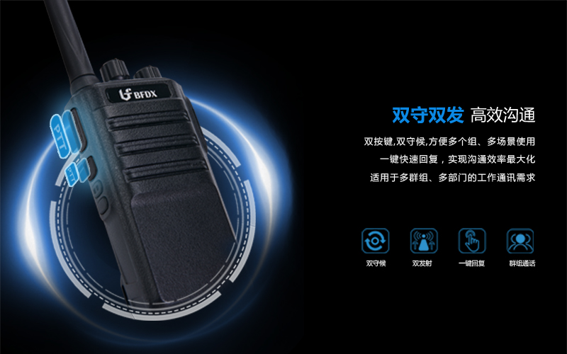 在遇到特殊、緊急情況下,雙頻道守候還可實現一個信道守聽主用通話信道,一個信道守聽緊急呼叫信號,避免關鍵信息的遺漏;此外,用戶無需人工判別接收信號來自哪個信道,在規定時間內按下任意PTT按鍵即可自動回復該信息,一鍵快速回復,實現溝通效率。