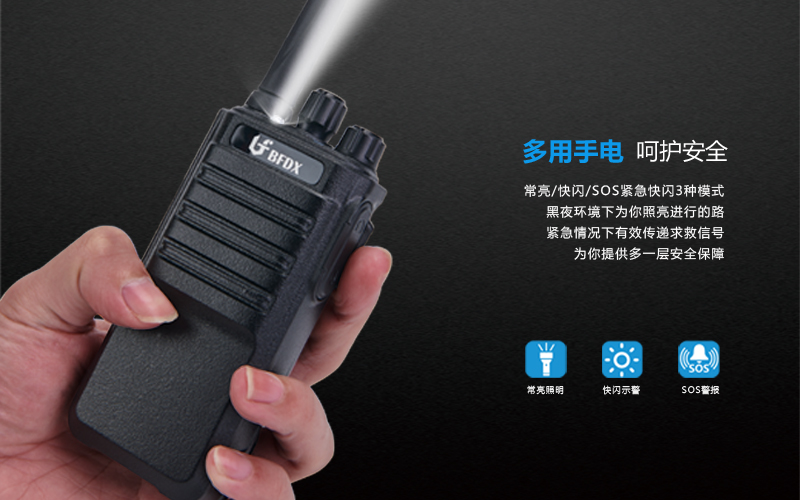 BF-500可一鍵開啟LED聚光手電功能,擁有常亮/普通快閃/SOS緊急快閃3種模式。在黑夜環境下,超強亮度的手電照明功能可替代手電筒解決燃眉之急,幫助用戶擴展視野;SOS強光爆閃模式,便于緊急情況下傳遞求救信號,更是為用戶提供多一層安全保障。