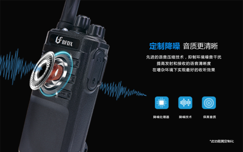 BF-500支持自定義靜噪等級設置,根據使用環境變化實現好的收聽效果。結合先進的語音壓縮技術,進一步抑制環境噪音干擾,提高發射和接收的語音清晰度,特別適用于在嘈雜環境下使用,確保每一次通話話音清晰、明了。