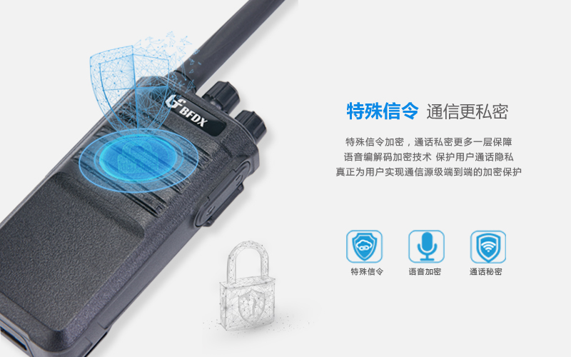 BF-500充分考慮了通信的保密性。北峰語音編解碼技術和數據加密技術,徹底杜絕有意竊聽風險或串頻導致的信息泄漏,真正為對講機用戶實現信源級端到端的加密保護,幫助用戶以較低成本實現高安全性的保密通話,滿足工商行業客戶在不同應用場景下對于無線對講的安全需求。