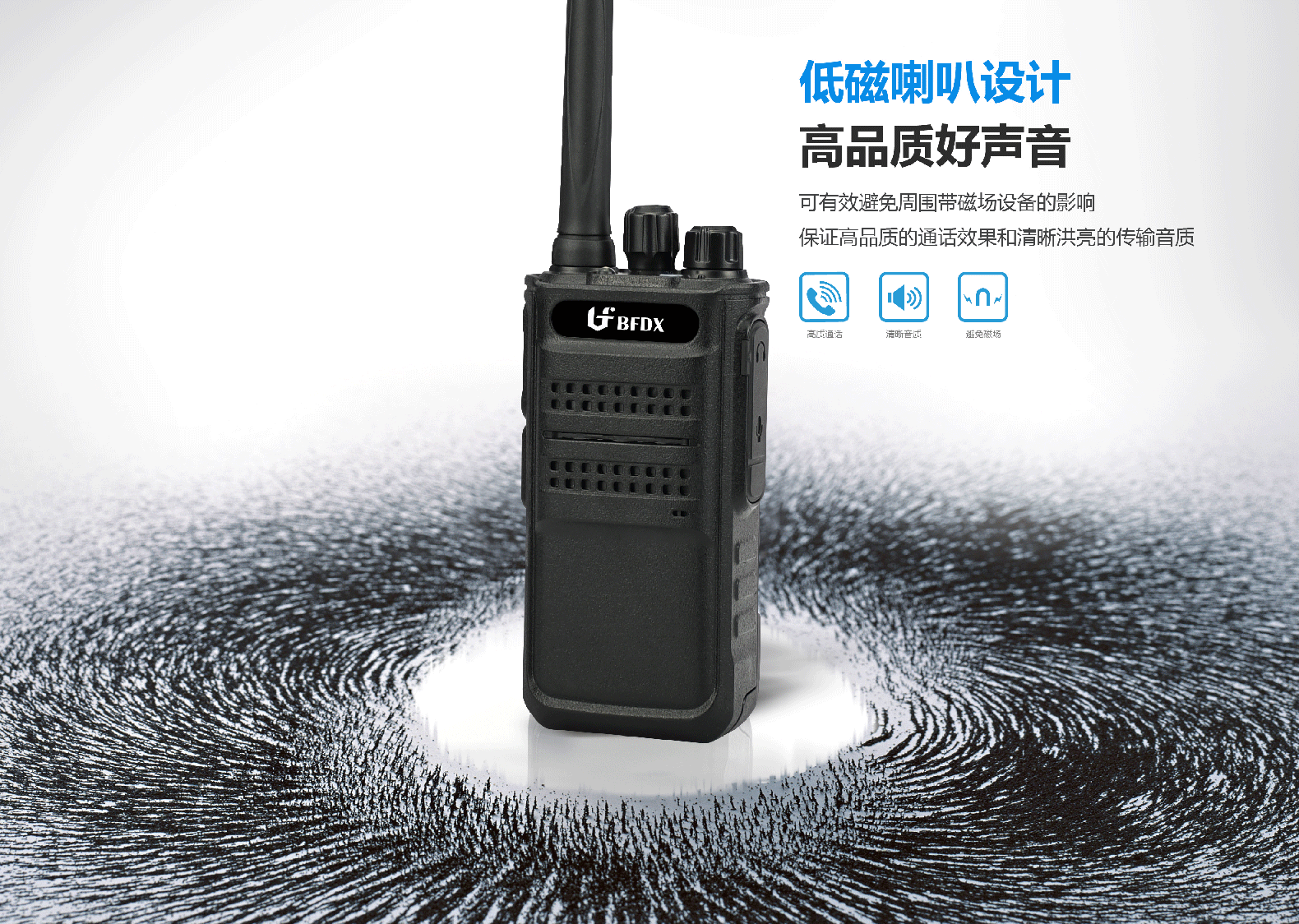 為了適應不同的使用環境,BF-312模擬對講機選用特殊低磁喇叭設計,可有效避免周圍帶磁場設備的影響,防止吸附灰塵粉塵及顆粒物進入,保護對講機不受水、灰塵、污垢和雜質影響,從而保證高品質的通話效果和清晰洪亮的傳輸音質。